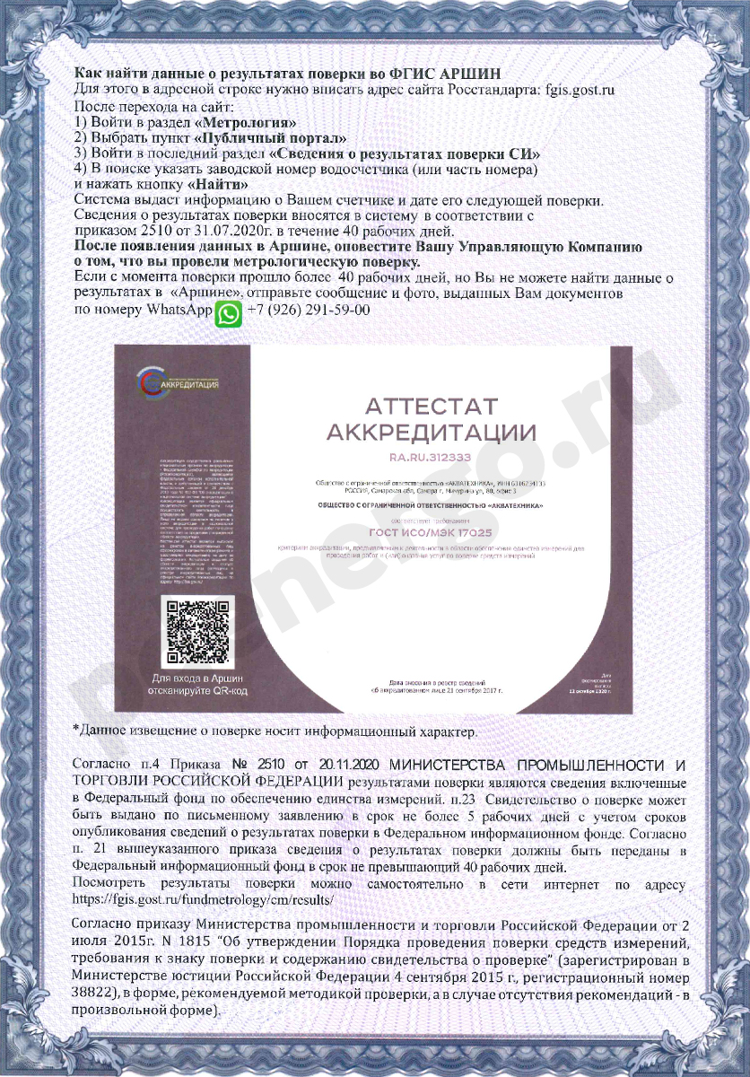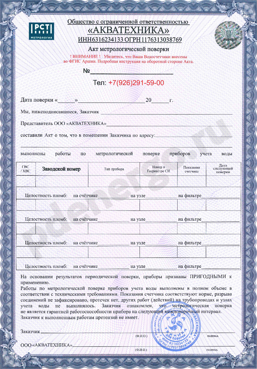 Метрологический центр сотрудничает с ведущей российской лабораторией компания Акватехника (ИНН 6316234133) номер аттестата аккредитации № 312333, и от ее имени оказывает услуги на проведение метрологических работ. По результатам поверки водосчетчиков будет предоставлен акт и внесена информация в Единую Федеральную Государственную Систему Аршин в течение 1-7 дней. На оборотной стороне акта указана инструкция, как найти по номеру счетчика информацию в ФГИС Аршин.